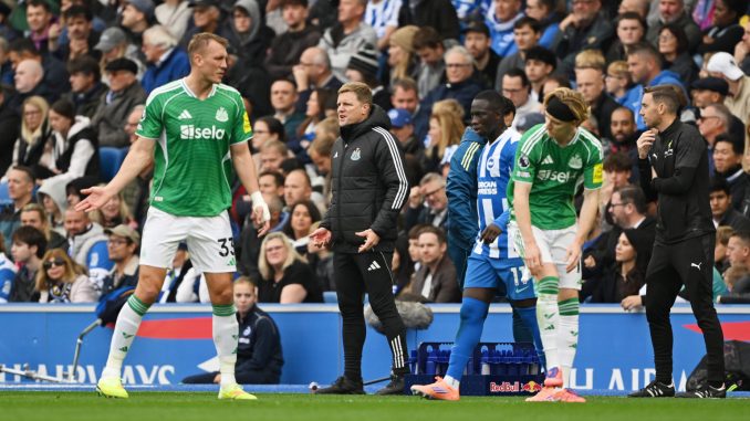 BRIGHTON, ENGLAND - OCTOBER 18: Eddie Howe, Manager of Newcastle United, reacts during the Premier League match between Brighton & Hove Albion and Newcastle United at Amex Stadium on October 18, 2025 in Brighton, England. (Photo by Mike Hewitt/Getty Images)